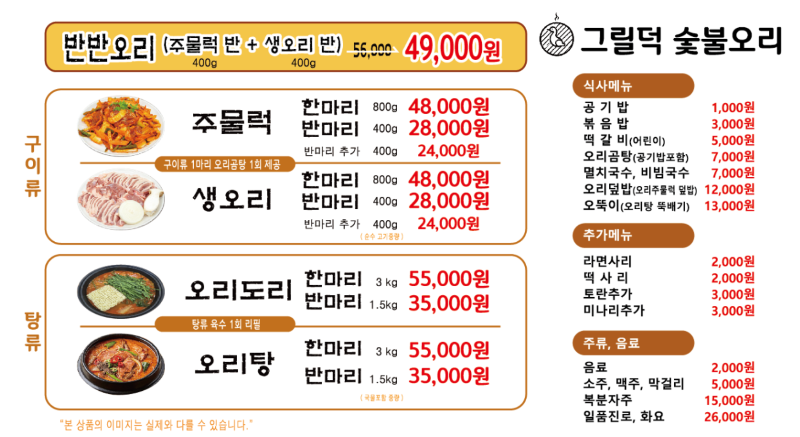 생오리(오리로스), 주물럭, 오리탕 한마리, 오리탕 뚝배기, 오리도리탕, 오리곰탕등 오리로 관련된 요리는 다 있는 듯했어요ㅎㅎ