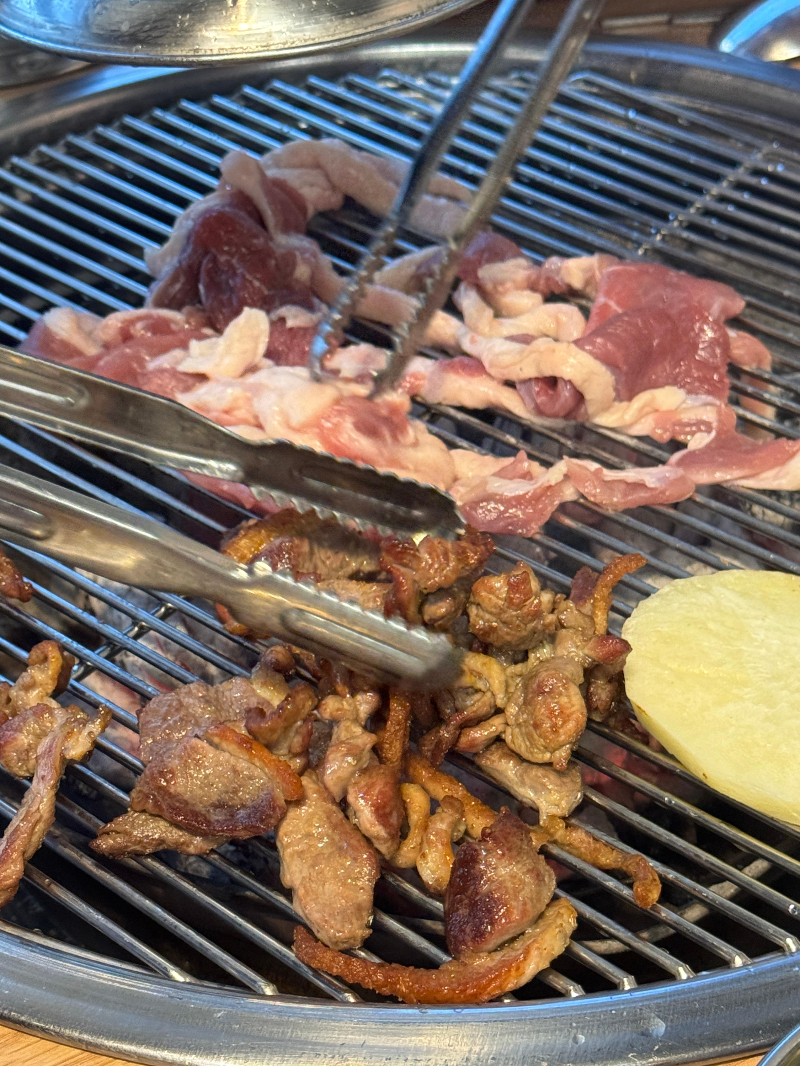 한 상에 오리로스와 주물럭을 한 번에 먹을 수 있었어요. 직접 피운 참숯 위에 오리고기를 올리면 지이익 소리를 내며 고소한 향이 진동을 하고 한쪽에서는 오리 주물럭이 살짝 달달하면서 매콤한 맛이 중독적이었어요. 불맛이 약간 베여있어서 더 맛나게 느껴지더라고요.