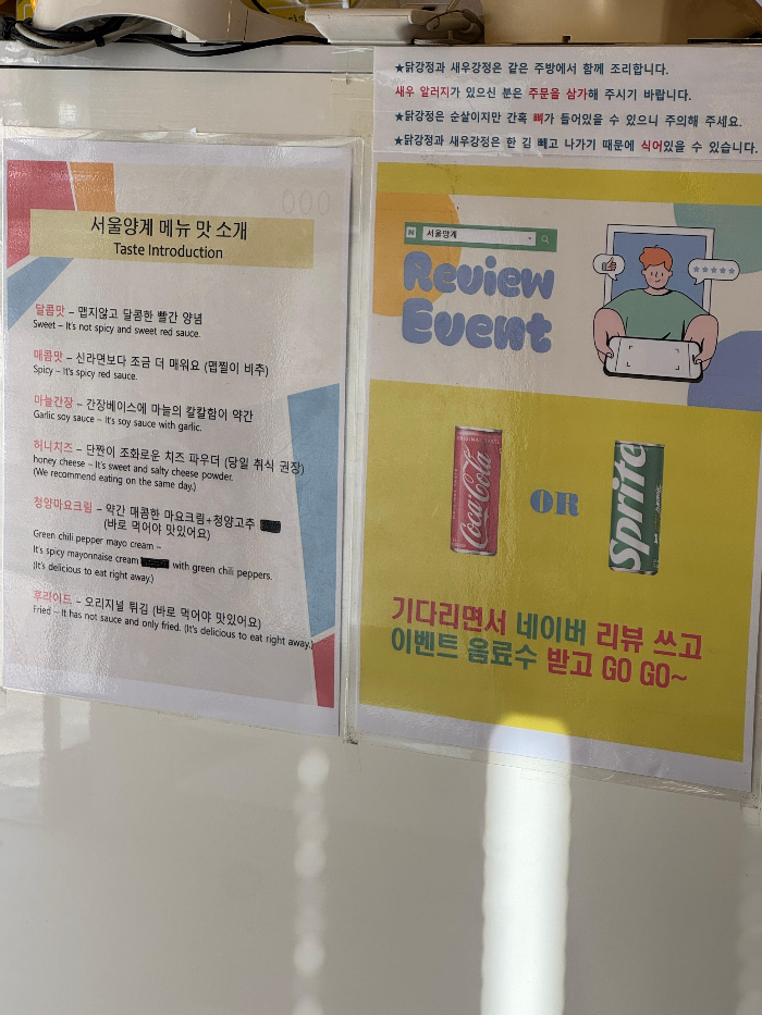 서울양계는 주차장도 있어서 테이크아웃하기에도 좋았어요. 오픈시간에 방문을 하게 되면 미리 방문을 해도 오픈시간 맞춰서 주문을 받기 때문에 오는 순서대로 주문을 할 수 있었어요. 제 생각에는 배달도 되고 전화 주문도 되니 전화하고 픽업하러 가는 것도 좋을 것 같아요.