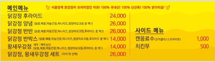 메인메뉴로 닭강정 후라이드, 닭강정 양념, 닭강정 반반, 닭강정 반박스, 왕새우강정이 있었어요.